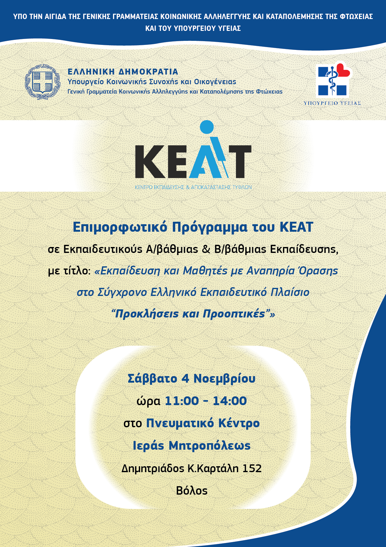 Το ΚΕΑΤ υπό την αιγίδα της Γενικής Γραμματείας Κοινωνικής Αλληλεγγύης και Καταπολέμησης της Φτώχειας και του Υπουργείου Υγείας, διοργανώνει Επιμορφωτικό Πρόγραμμα για Εκπαιδευτικούς Α/βάθμιας και Β/βάθμιας Εκπαίδευσης, με τίτλο “Εκπαίδευση και Μαθητές με Αναπηρία Όρασης στο Σύγχρονο Ελληνικό Εκπαιδευτικό Πλαίσιο “Προκλήσεις και Προοπτικές”, το οποίο θα πραγματοποιηθεί το Σάββατο 4 Νοεμβρίου και ώρα 11:00 – 14:00 στο Πνευματικό Κέντρο Ιεράς Μητροπόλεως Δημητριάδος, Κ. Καρτάλη 152, Βόλος.